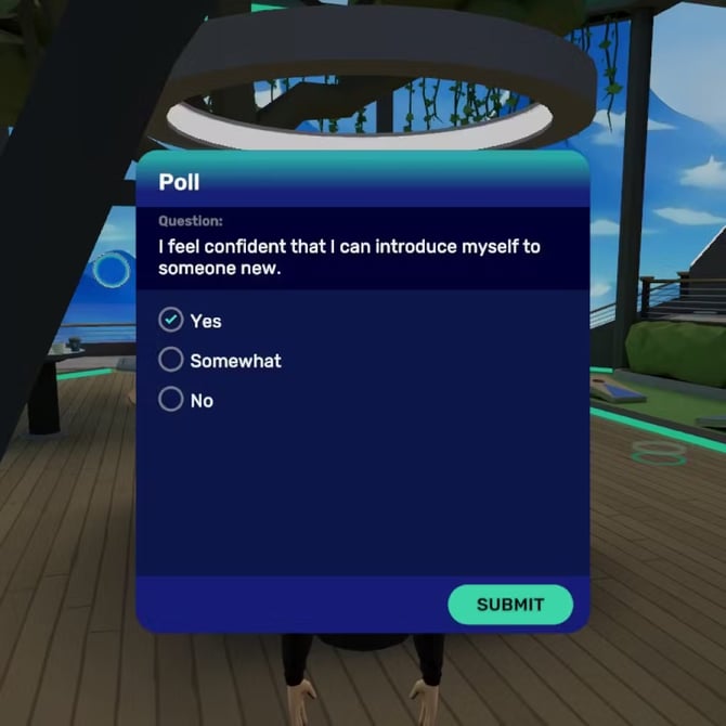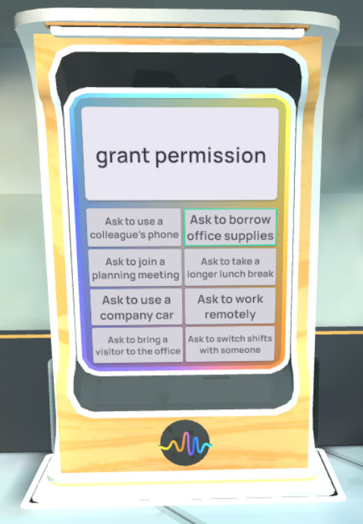 Uma lista de opções é exibida em um prompt aninhado. Ao selecionar um botão, a resposta é revelada. Clique nos botões com o mouse no computador ou use sua mão em realidade virtual para selecionar uma opção.