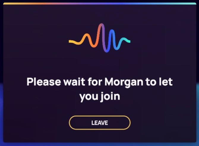 Ao participar de uma aula ao vivo, você será teletransportado para a sala de realidade virtual onde o Guia está conduzindo a sessão. Enquanto sua conexão é finalizada e seu nome aparece para que o instrutor o admita, você verá uma tela de espera.