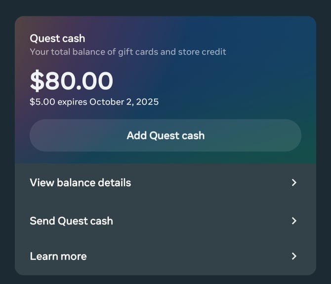 Para usar um Cartão Presente Meta Quest, você precisa resgatar o valor total do cartão vinculando-o à sua conta. Após o resgate, o valor total do Cartão Presente Meta Quest será adicionado ao seu saldo em dinheiro Quest.