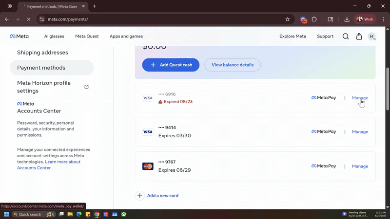 Acesse https://www.meta.com/payments e selecione Adicionar um novo cartão .